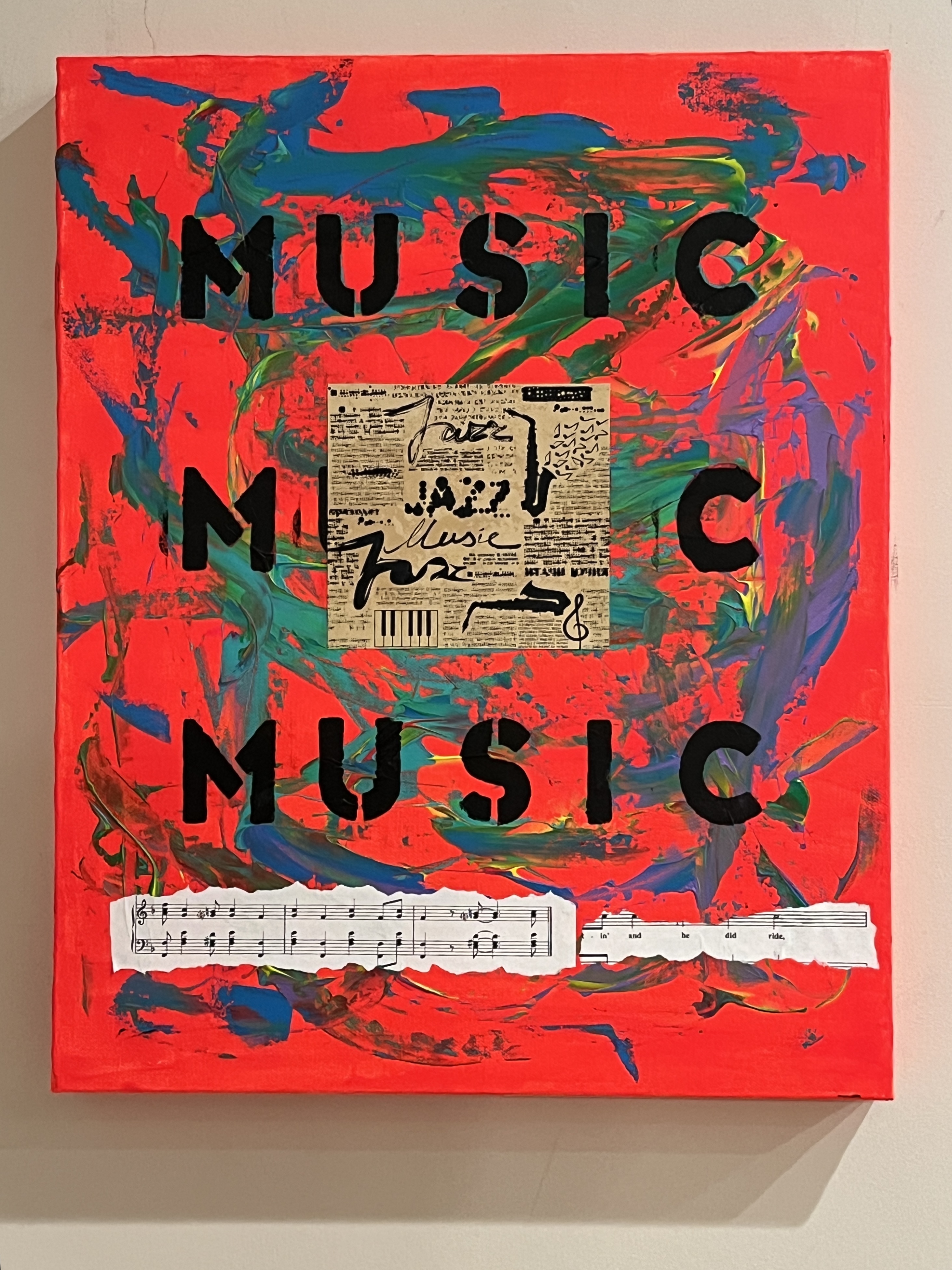 Multi media collage and acrylic abstract on paper, canvas, mason and wood