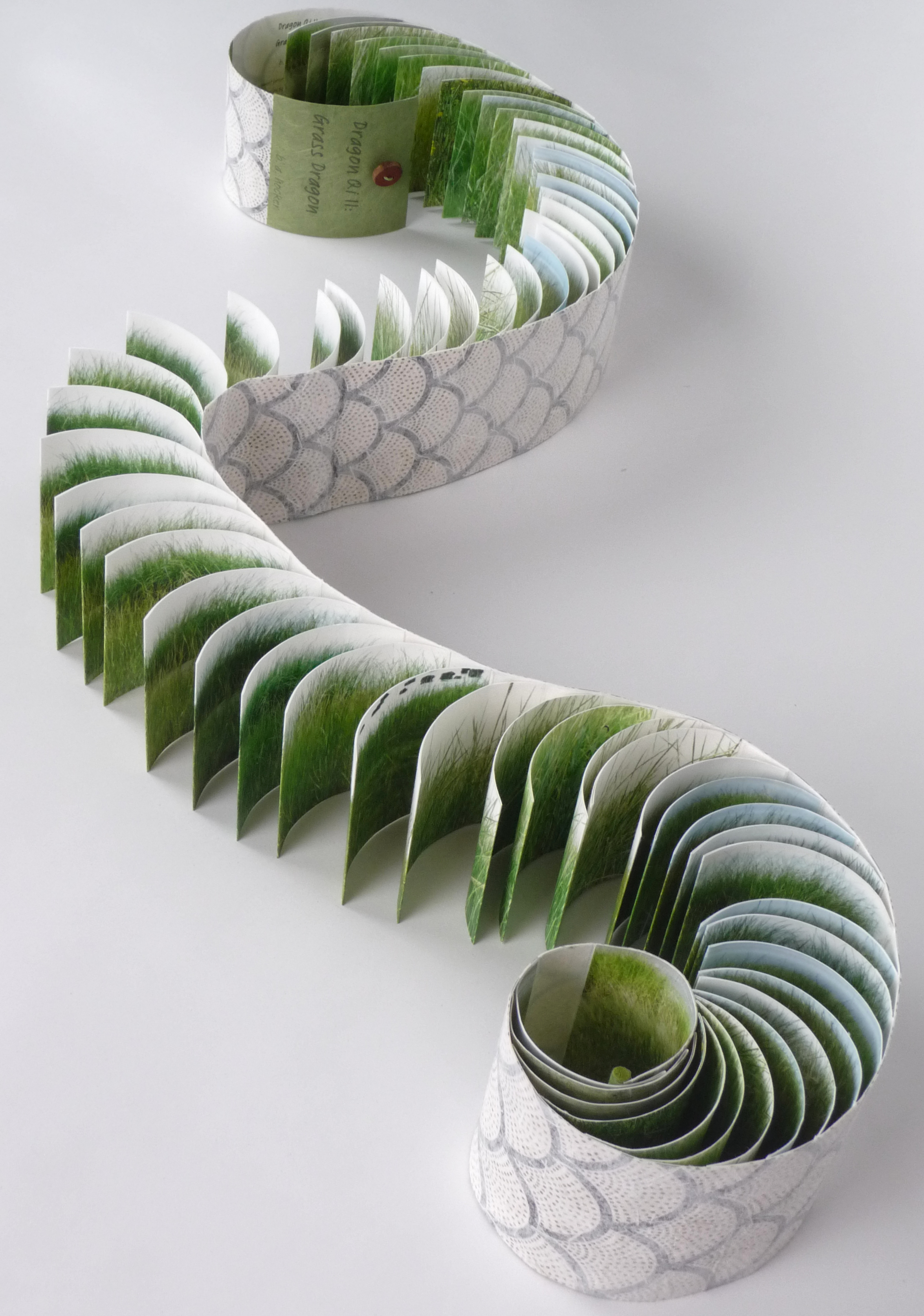 I use the same images and haiku to explore various book formats and bookbinding techniques ranging from hardcover accordion fold books to book sculptures. Seriality, repetition, and the encoding of time are all present in the building up of the book stitch by stitch and page by page. Trained as a Fiber Artist, I am attuned to how many small actions can build up to larger effects. In the same way, our seemingly small personal actions can combine to begin to heal us and the Earth.