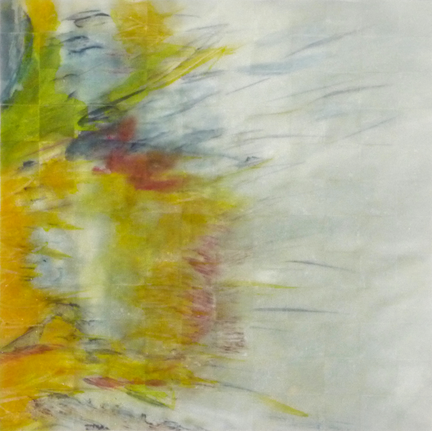 I start by capturing images with various digital cameras and lenses. I shoot skies, waterfalls, streams, rivers, lakes, and the sea. I look to find the feeling of the moment and place and often write haiku to accompany images or pieces. I print the photographs, pull abstract monotypes, and paint watercolors on thin sheets of rice paper, infusing them with encaustic wax. Papers are cut into strips and woven together then mounted onto panels. The wax makes the paper translucent and blends the images together, creating a sense of depth and movement.