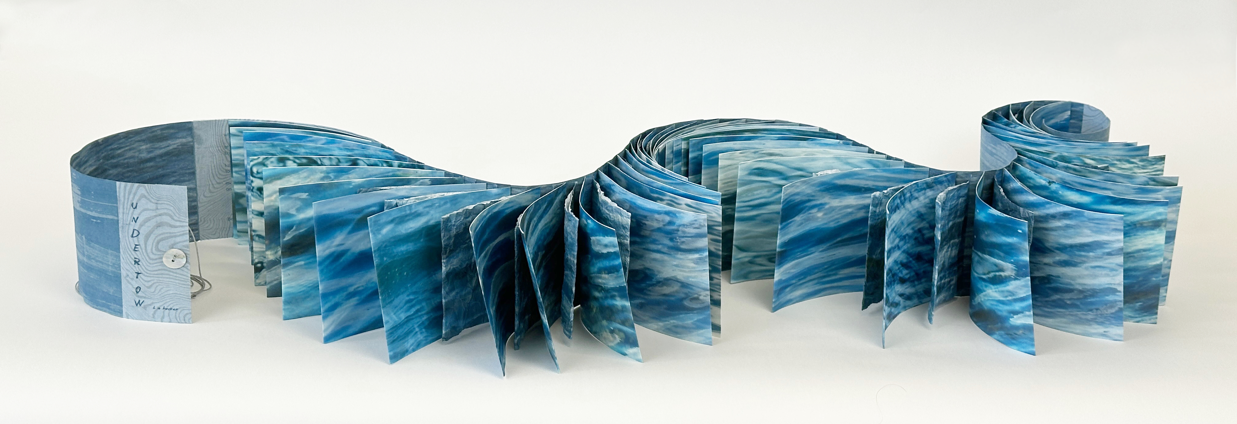 Barbara Hocker is a Connecticut mixed-media artist based in Hartford. She was born in South Norwalk, where she lived between the beach and saltwater marsh, her life organized by the tides. Barbara has focused on expressing tranquility, ephemerality, and meditation in her artwork with water as her current subject. She collages digital photographs with prints/paintings by weaving the paper and infusing it with encaustic wax, creating works on panel, handmade books, and installations. She also sometimes writes haiku to accompany her artwork.