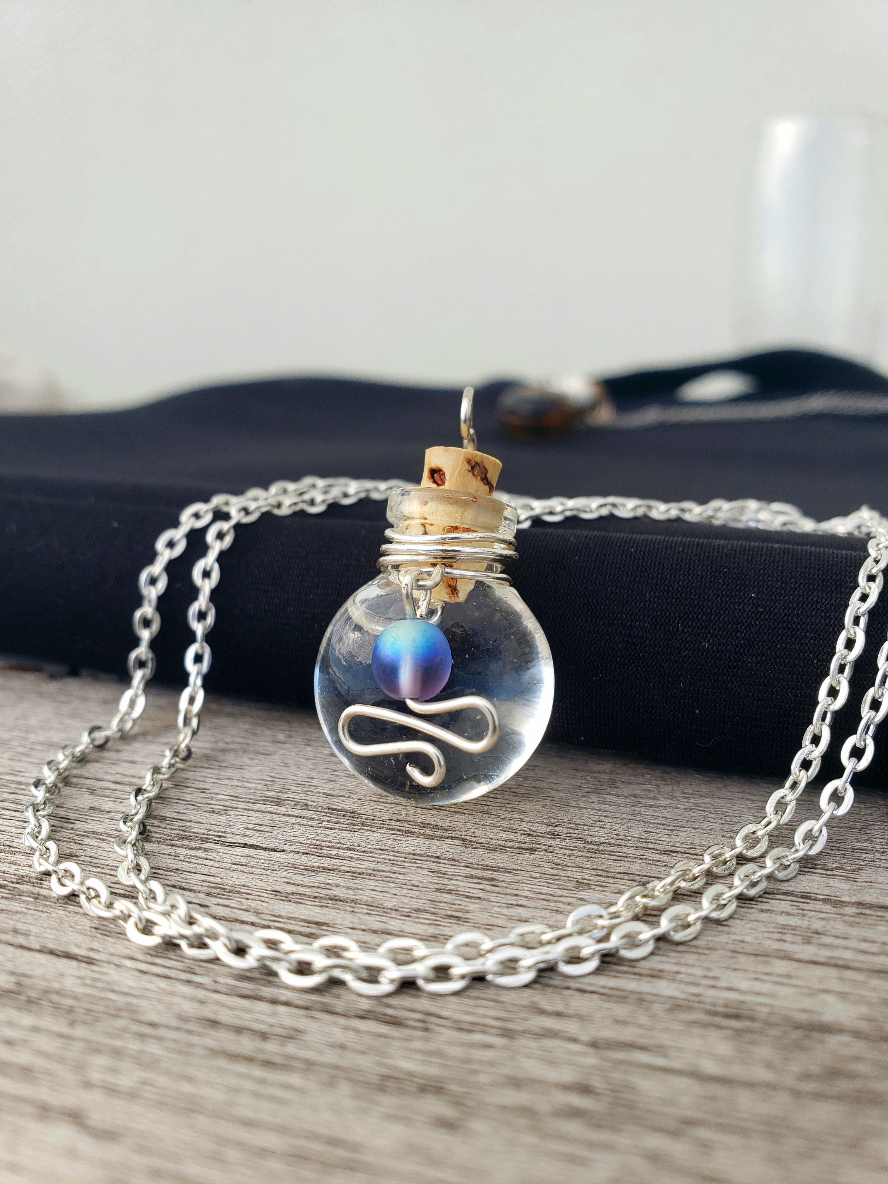 Essential oil diffuser necklaces made from miniature glass bottles, each pendant wire wrapped and embellished into unique designs that complement and amplify the energy of 100% pure essential oil inside. The essential oil wicks up through the cork for attractive aromatherapy on-the-go. Each order comes with an aromatherapy breathing exercise to help us stay grounded through these trying times.