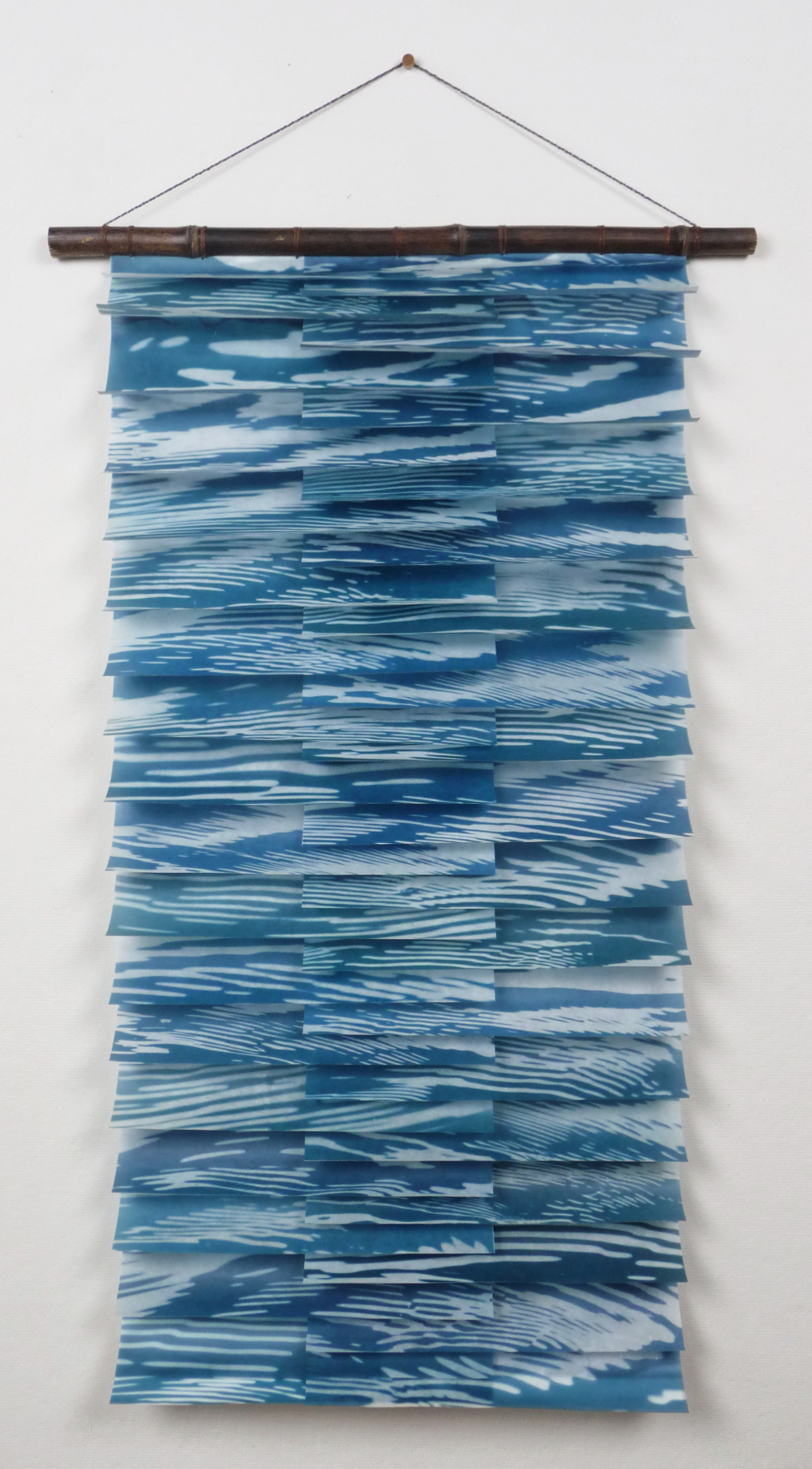 Barbara Hocker is a Connecticut mixed-media artist based in Hartford. She was born in South Norwalk, where she lived between the beach and saltwater marsh, her life organized by the tides. Barbara has focused on expressing tranquility, ephemerality, and meditation in her artwork with water as her current subject. She collages digital photographs with prints/paintings by weaving the paper and infusing it with encaustic wax, creating works on panel, handmade books, and installations. She also sometimes writes haiku to accompany her artwork.