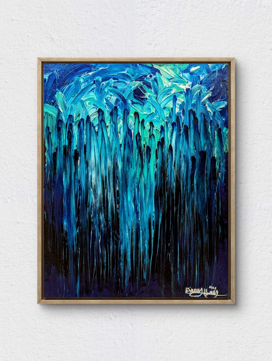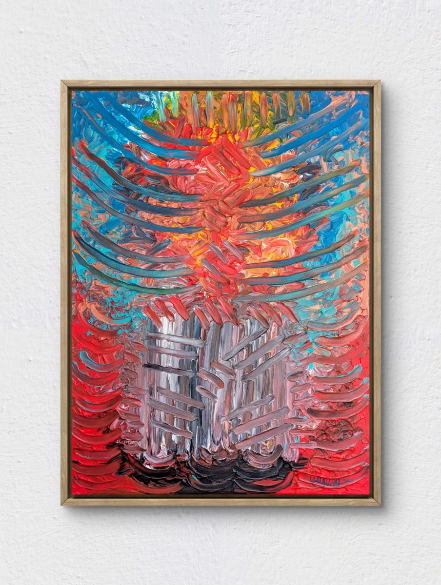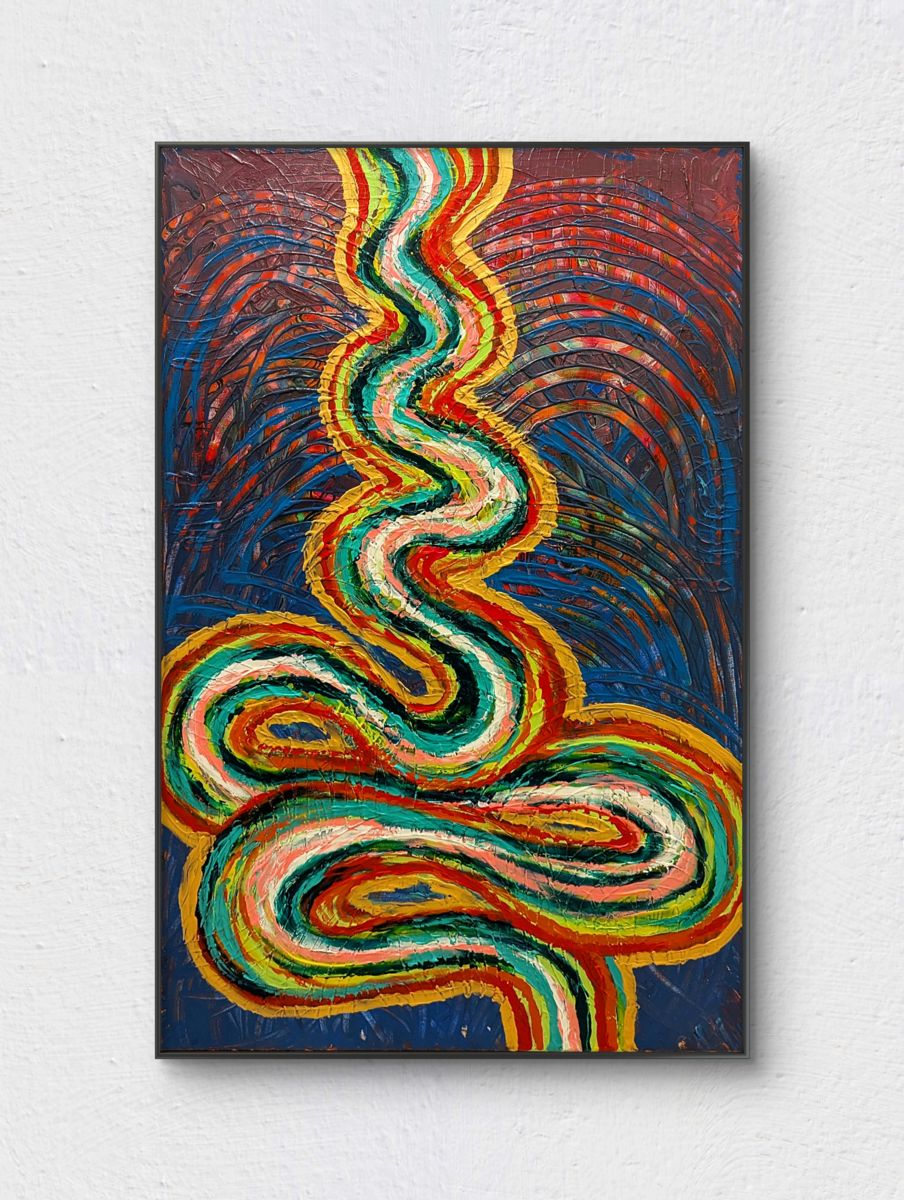 Her artwork offers an authentic and colorful glimpse into her world of trauma, healing, and self-expression. Using acrylic paints, her hands, and occasional brushstrokes, she creates each piece intuitively. The meaning of the artwork is revealed after its creation, capturing the raw emotion and soul within each piece.