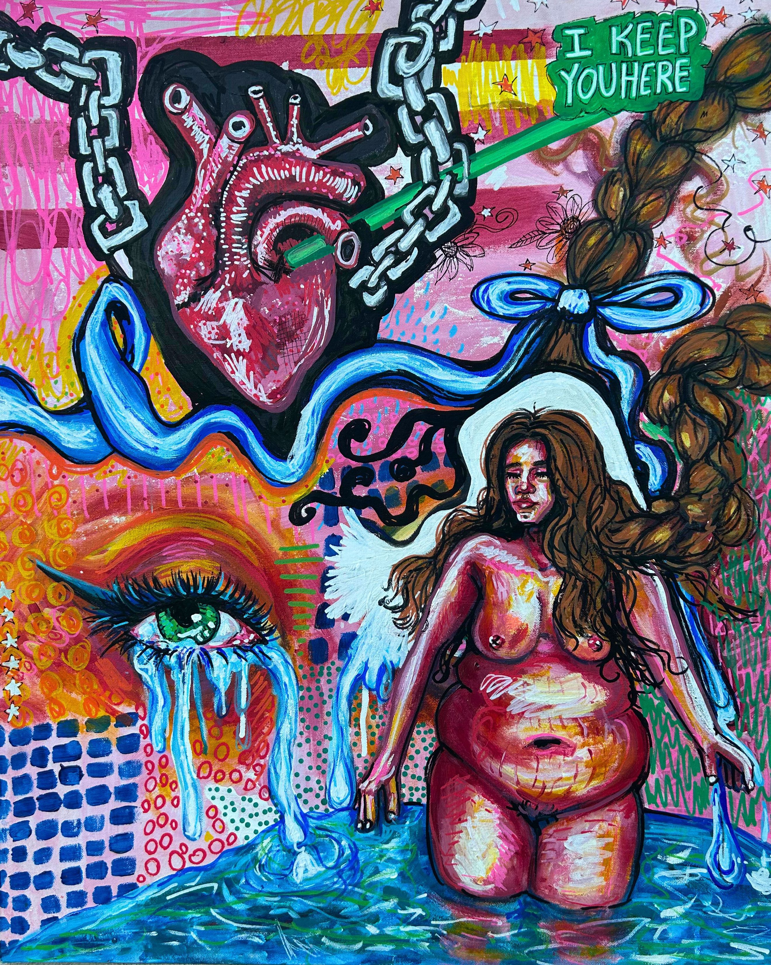 I predominantly work on mixed media paper with acrylic paints and colored pencils, in addition to acrylic on canvas paintings. Elements of collage unfold in my zines with found materials or collected artwork and sketches. My monochromatic work is a space to document and process moments in my life. The bright and surrealistic scenes and zines I create are where dreaming, reflection, and healing occurs. My work has held everything I have ever lived through, it continues to grow and change with me.