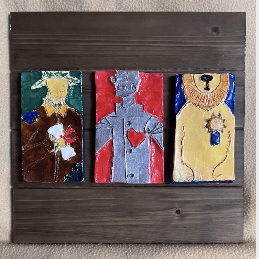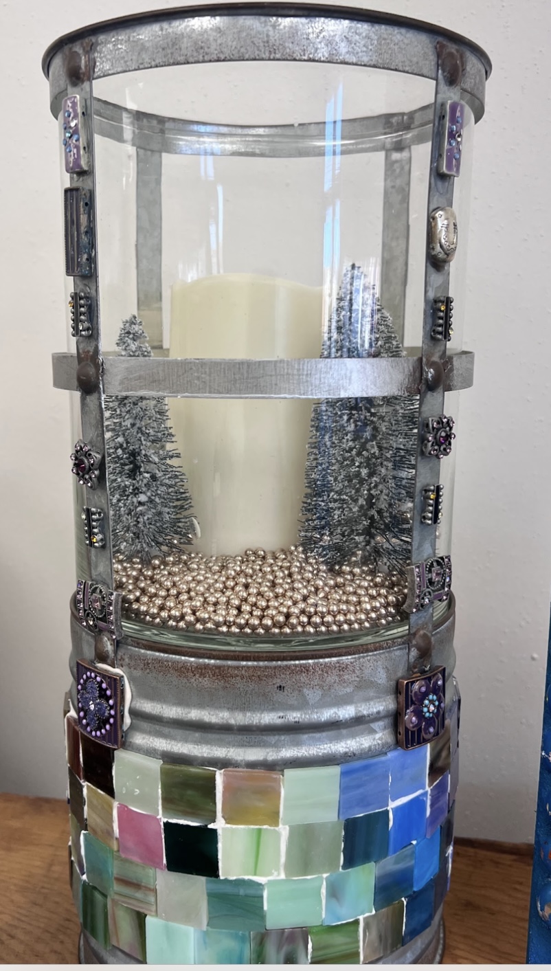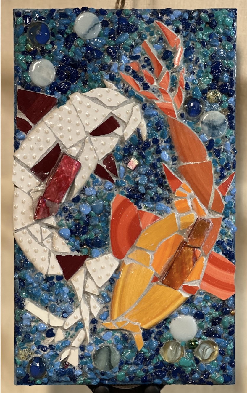 On unique substrates she assembles ceramic, tile, glass, stone, tessere, antique smalls, paint, wood, nature, hardware, jewelry, and found materials in an uncommon manner. Lifetime resident of Enfield, she is a member of Art Connects Enfield and Art Works Westfield and enjoys playing the banjo.