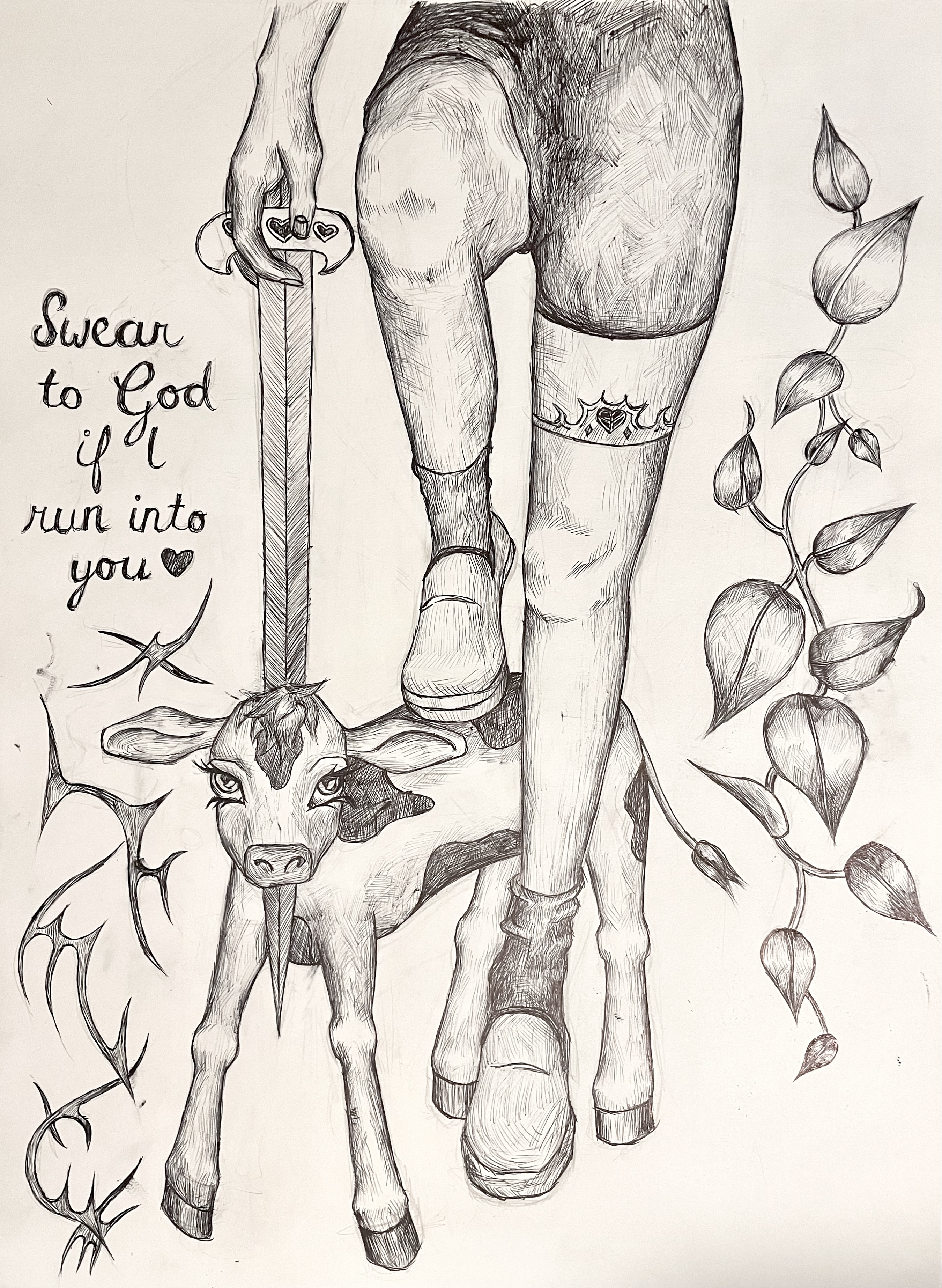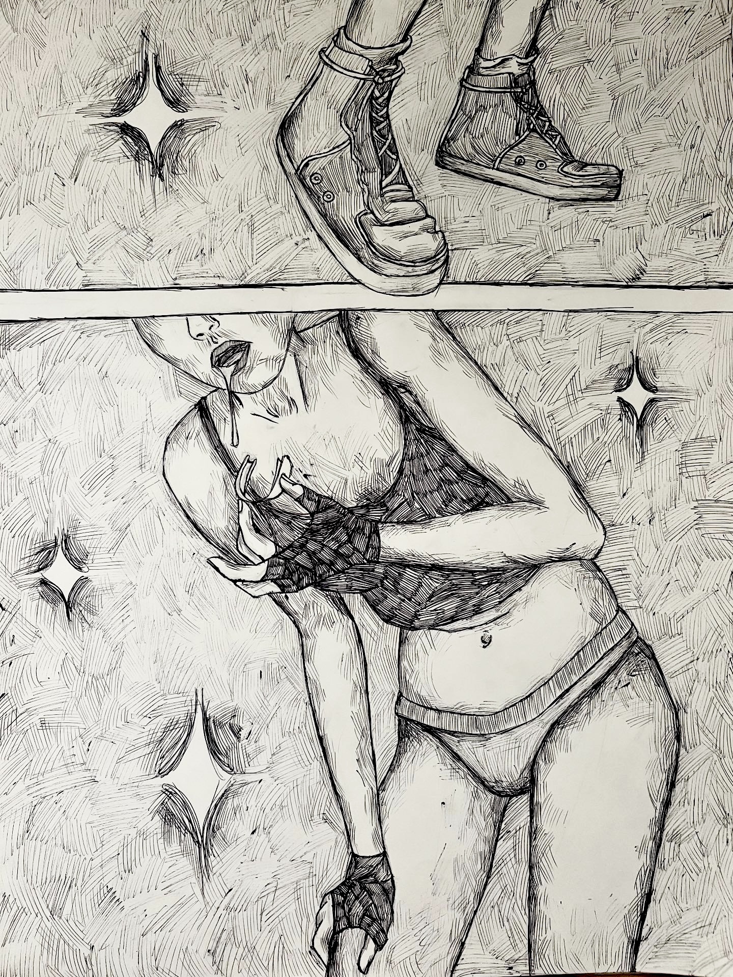 Tulane alumnus Colleen Hugo (they/them) lives, works and creates just outside of Hartford, Connecticut. Their large-scale pen and ink drawings draw upon the surrealist art movement, utilizing organic forms in unclear settings to construct an environment as uneasy as it is captivating. Void of context, their depictions of people, animals, and plants strip away preoccupation with the day-to-day and highlight the inherent discomfort of existence itself. Colleen considers their work—which is informed by their personal experience with bipolar disorder—to be a humanist exploration of living, despite.