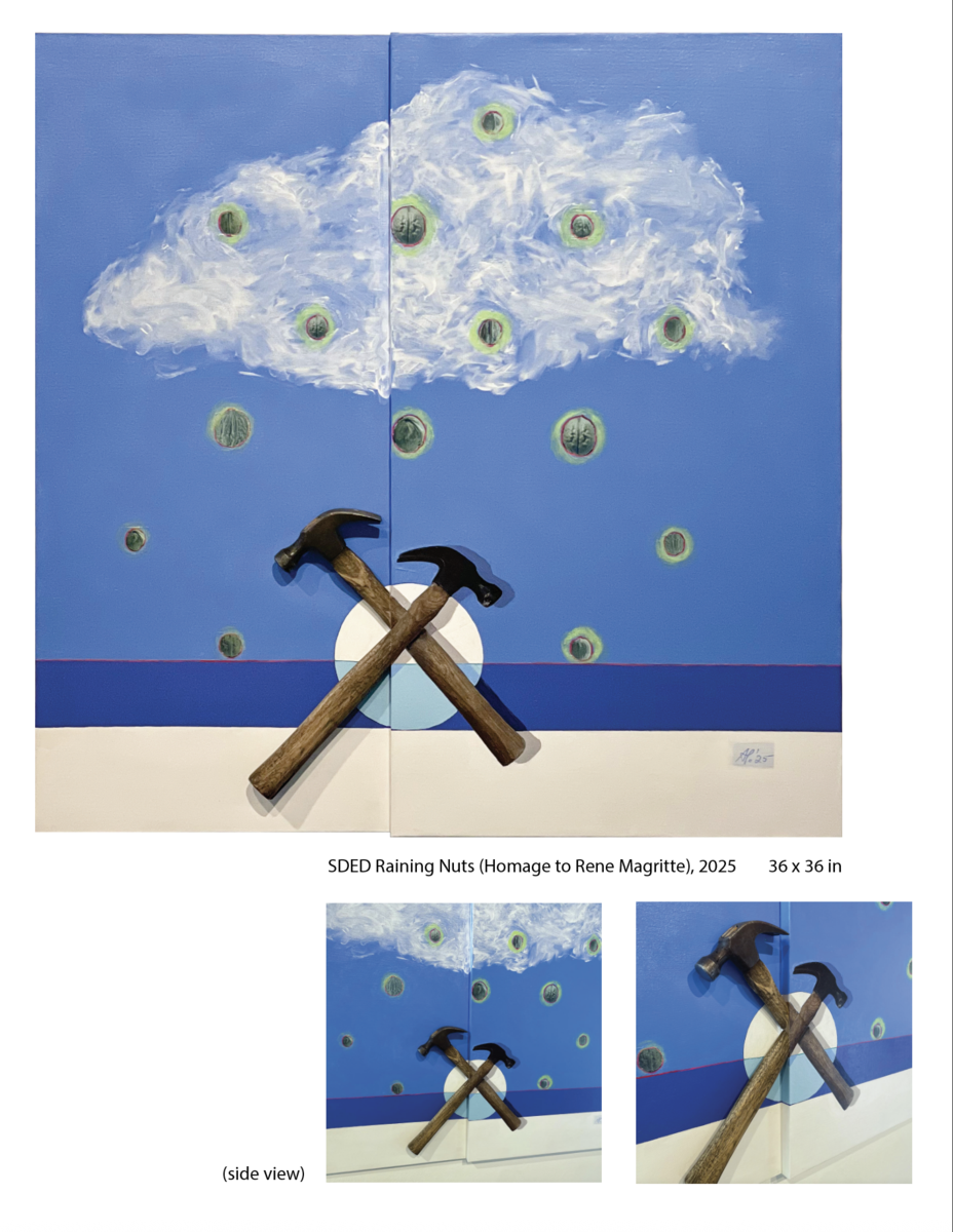I am a conceptual artist aiming to unify the creative philosophies of Lucio Fontana, Agostino Bonalumi, and Zilia Sánchez by merging painting (2-D) and sculpture (3-D) using the two dimensional surface of the canvas as the most logical building block in achieving such a goal. The theoretical 2.5 dimension—the bridge between two and three dimensions—can be achieved (intellectually and visually) through layers, optical illusion, real objects, and relevant, topmost color contrast. Generally, my art which celebrates science, creativity, and excellence also deals with temporary issues that should help enrich and deepen our thoughts in understanding our reality [“Cogito, ergo sum,” Rene Descartes’s first principle], it relates to how being alive now on earth will lead us together to viable solutions to attend all contemporary pressing and critical issues.